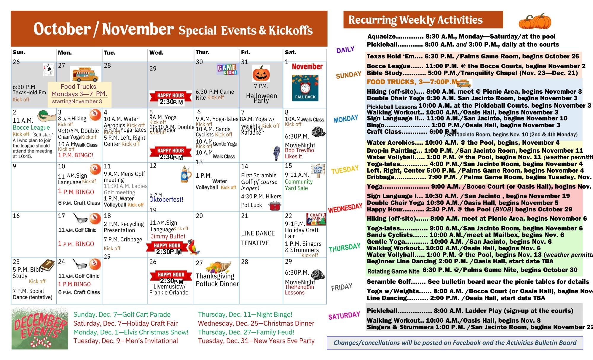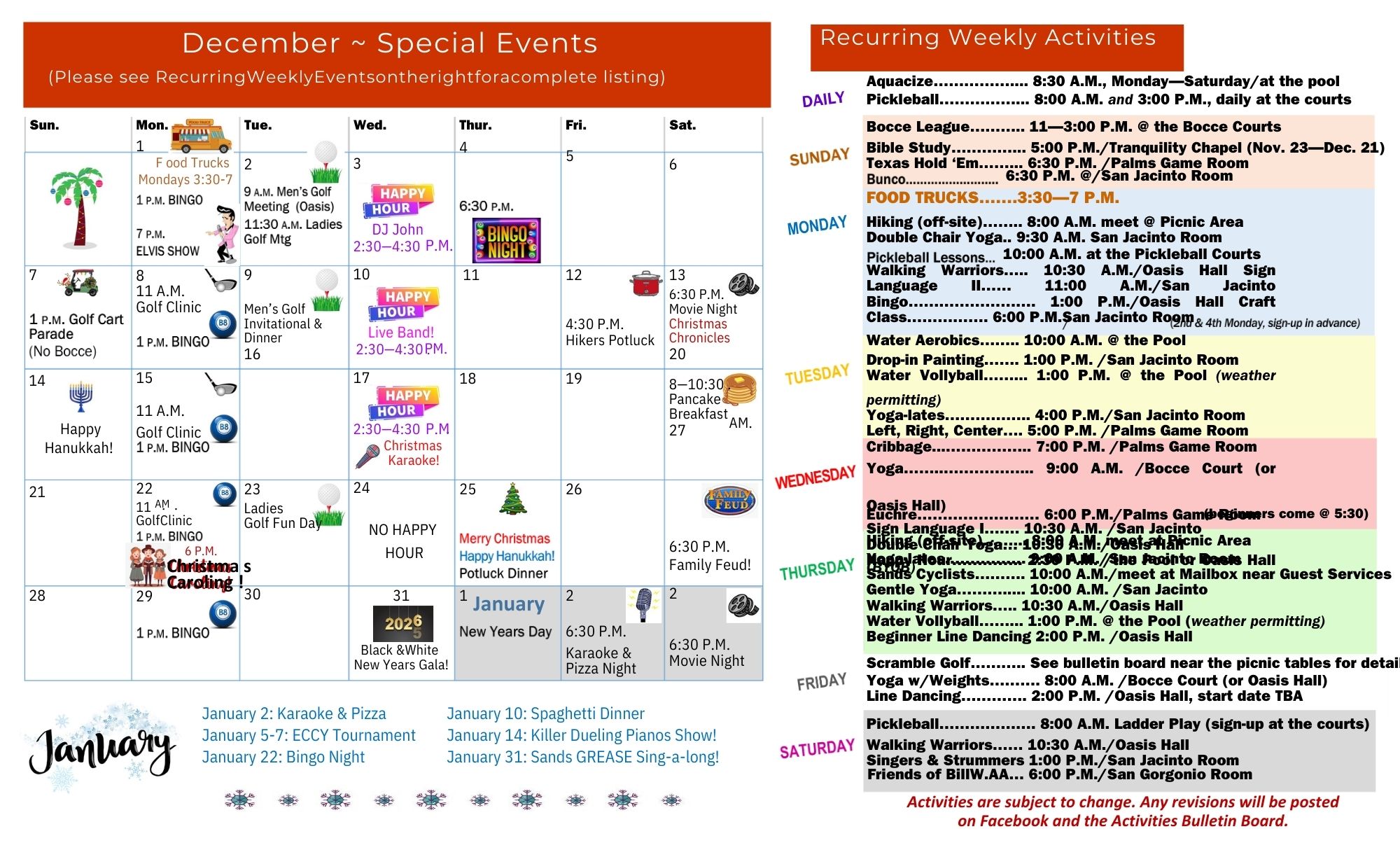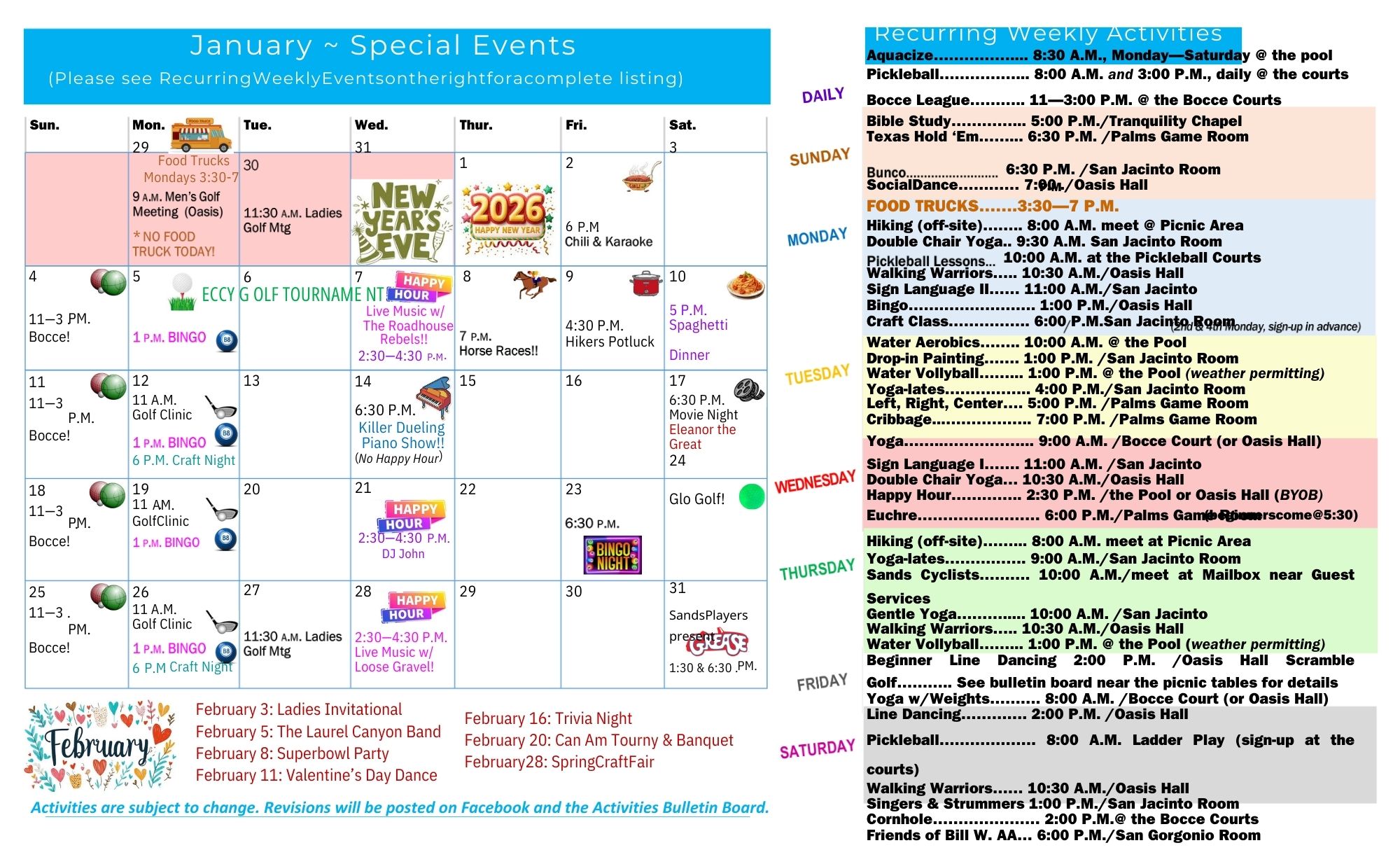 Regularly scheduled events include food trucks, bingo, water aerobics, bocce ball, pickleball, karaoke, movie nights, golf clinics, dot painting, hiking potluck, craft fairs, holiday banquets, seasonal parties and so much more!